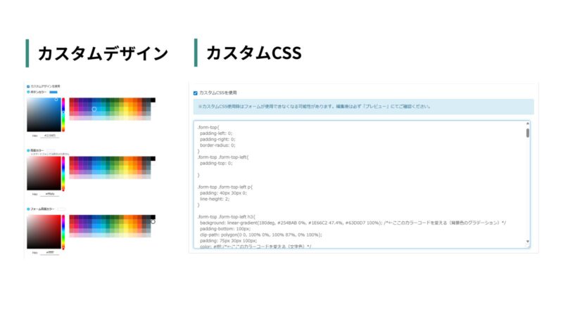 簡単な装飾は「カスタムデザイン」で可能ですが、他社と差別化を図り、ブランドイメージに合わせた独自のLP風フォームを作成するには「カスタムCSS」の活用が不可欠です。