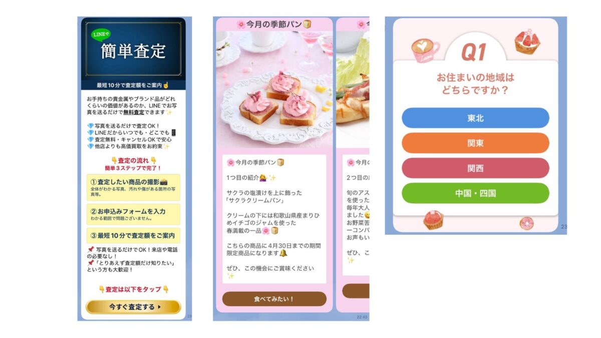 複数の画像を隙間なく並べることで、1枚の長いLPのように見せることができます。外部サイトへ遷移させる際の「離脱」を防ぎ、LINE内でクロージングまで導けるのが大きな強みです。