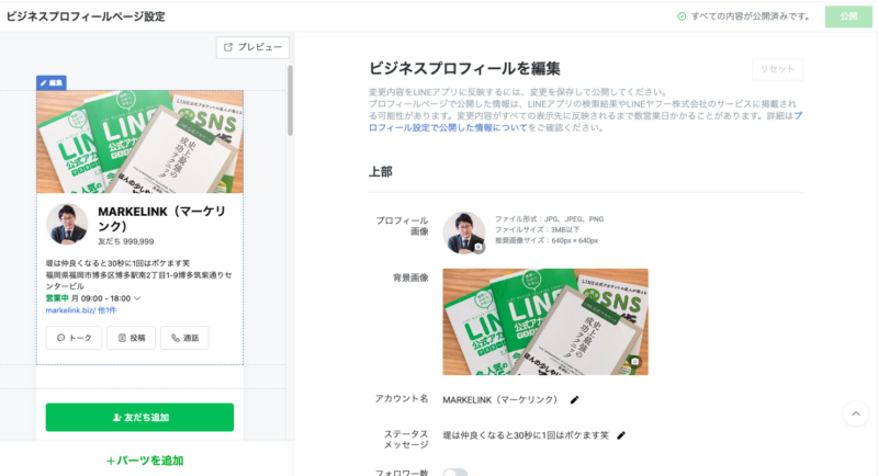 プロフィールページは、LINE内のミニホームページです。以下のパーツを必ず設定しましょう。