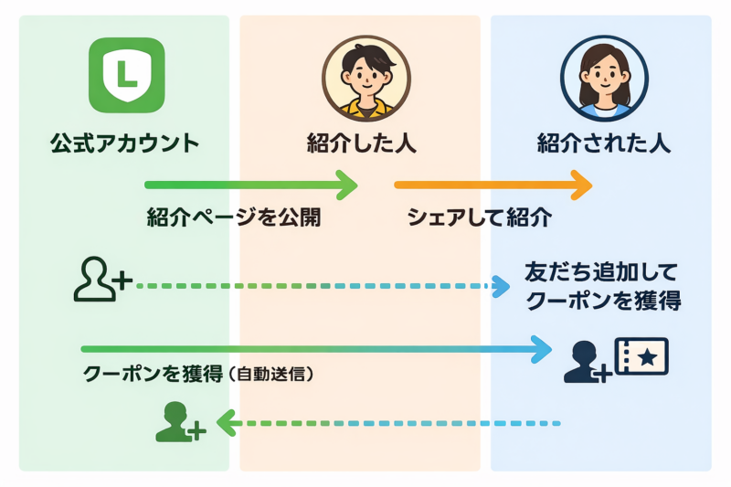 仕組み:紹介ページのシェア → 友だち追加 → 両者がクーポン獲得