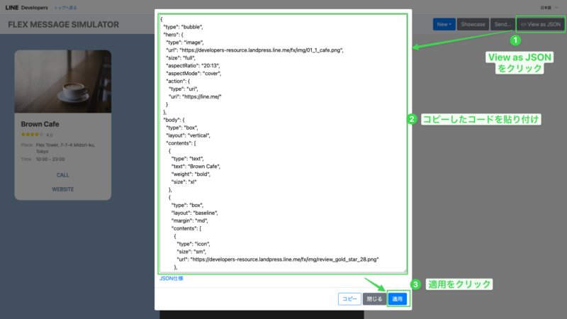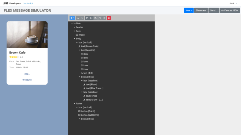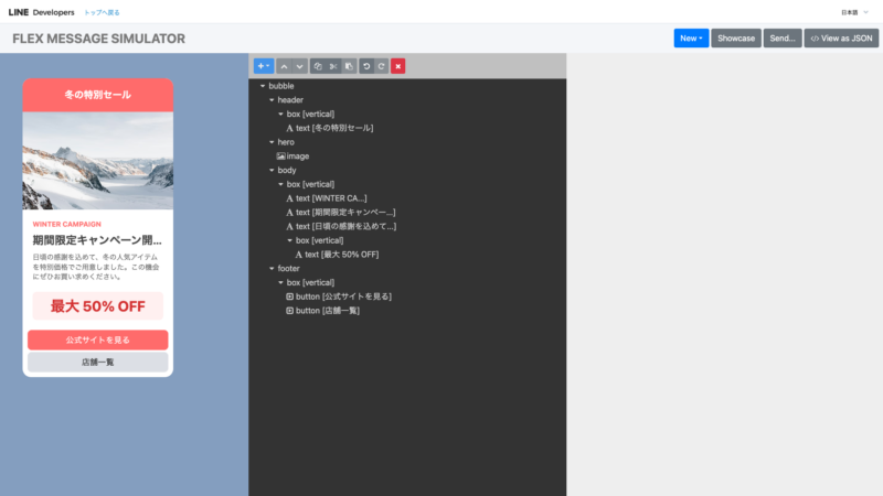 画像のように、Flex Messageが画面左部分のプレビューに表示されます。