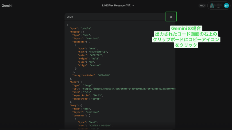 ・「LINE Flex MessageのJSON形式」であることを明記する。