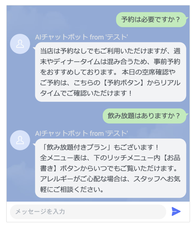 AIチャットボット(β): 「何時まで開いてる?」「夜は何時まで?」といった揺らぎのある質問に対しても、AIが内容を判断して最適な回答を返します。