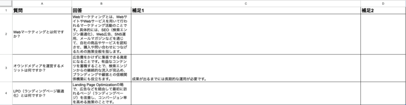 スプレッドシートに「Q(質問・疑問)」と「A(回答)」の2列を用意し、情報を記入していくだけ。