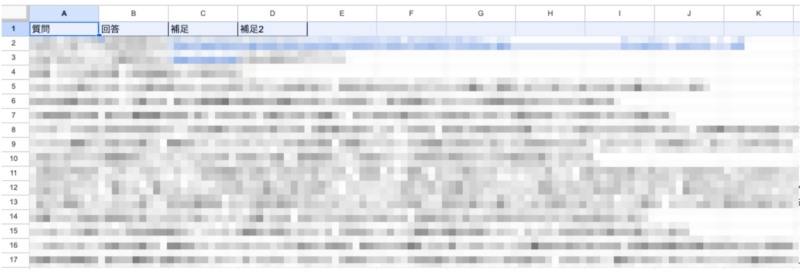 スプレッドシートに2つの列を用意し、一方の列に「Q(質問・疑問)」、もう一方の列に「A(回答)」を記入していくだけ。
