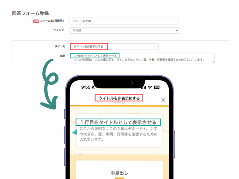具体的には、「回答フォームの説明文(テキストエリア)」の1行目に、タイトルとして表示したい文言を記載します。