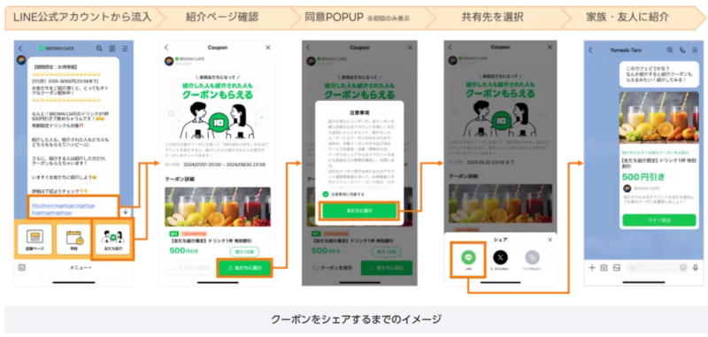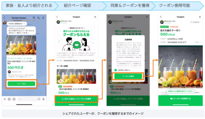 「友だち紹介クーポン」とは、既存の友だちがクーポン紹介ページをシェアし、それを受け取ったユーザーが新しく友だち追加をすることで、「紹介した人」と「紹介された人」の両方が特典を獲得できる仕組みです。
