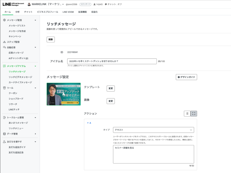 LINE公式アカウントの標準機能である「リッチメッセージ」は、画像やテキストを一つのビジュアルにまとめて配信できるメッセージ形式です。テキストだけでは伝わりにくい商品やキャンペーン情報などを画像つきメッセージで伝えることで、視覚的に訴求することができます。