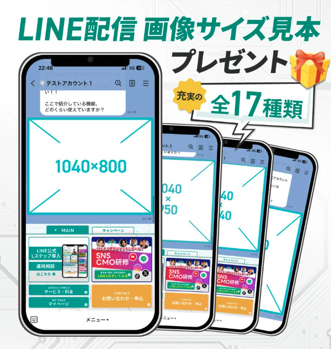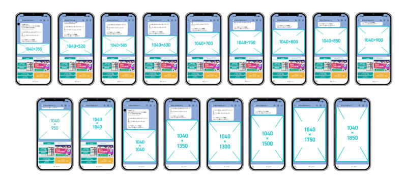 そこで今回、クライアントへの提案や自社内での仕上がり確認にそのまま使える「LINE配信画像サイズ見本(全17種類)」を特典としてご用意しました。1040px × 1040pxなどの主要サイズが、実際のスマホ画面でどの程度の表示領域で表示されるかを網羅したモックアップ集です。
