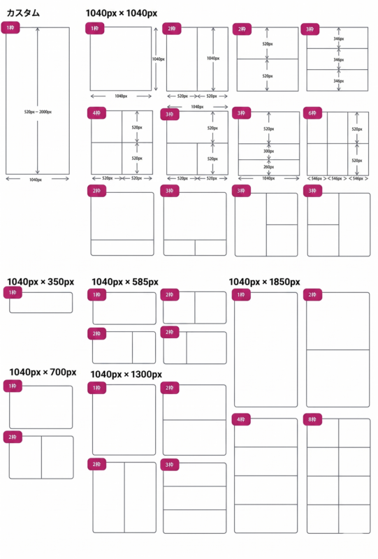 最も汎用性が高いのは、画像全体を一つのリンクにする「1分割」のタイプです。正方形(1040px × 1040px)は画面を大きく占有するため、インパクト重視のキャンペーンに最適です。一方で横長(1040px × 520px〜)は、テキストメッセージと組み合わせても画面を専有しすぎず、スマートな印象を与えます。