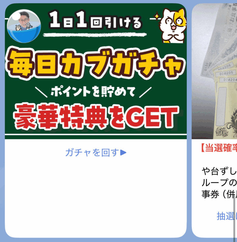「マネヲタ堤」のLINEでは、恒常的に「カブガチャ」というコンテンツを設置しています。これは、1日1回、LINE内でガチャを回すと、ポイントが貯まっていって、最終的には株主優待券がプレゼントとしてもらえるというものです。