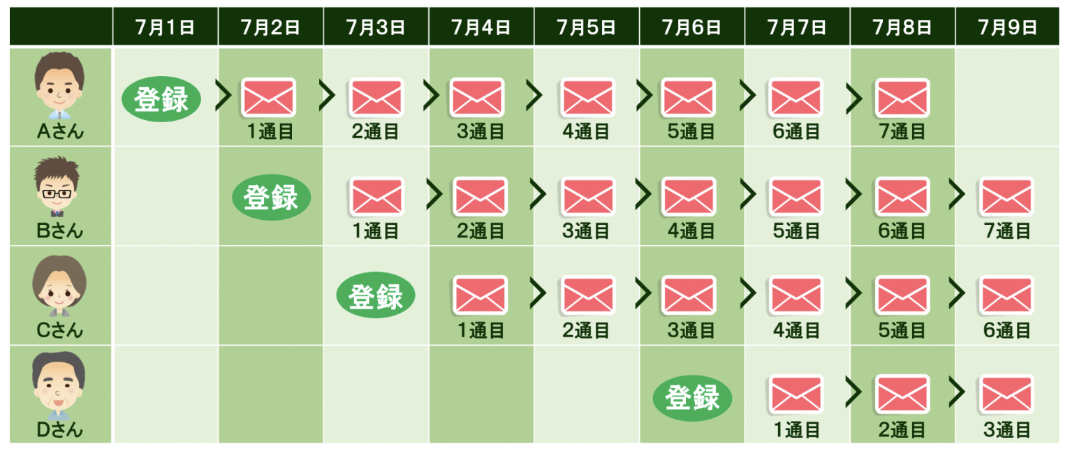 「マネヲタ堤」のアカウントではLステップを導入しています。Lステップを導入すると、友だち登録から自動的にステップ配信を流すことが可能です。図のように、登録した日が異なっても、順次送られてくる配信は同じになるわけです。