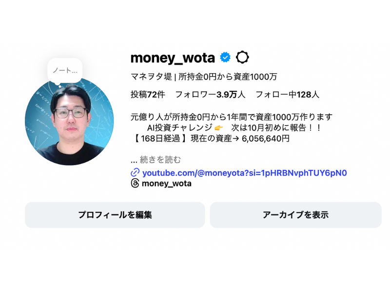 今回は、まさに私自身が運営しているアカウント「マネヲタ堤」を実例として公開します。当アカウントは、”所持金0円から資産1,000万円を目指す元億り人”というコンセプトで投稿を開始しました。
